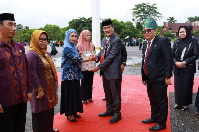 Kanalsultra.com, Konawe Utara – Peringati Hari Pendidikan Nasional (Hardiknas) tahun 2024, Pemerintah Daerah (Pemda) Kabupaten Konawe Utara (Konut) gelar upacara di Lapangan Upacara, Kantor Bupati Konut, Kamis (2/5/2024). Peringatan Hardiknas tahun ini mengusung tema nasional “Bergerak Bersama Lanjutkan Merdeka Belajar” sebagai pemicu semangat Pemda Konut untuk terus mendukung dan mengembangkan pendidikan khususnya di wilayah Kabupaten Konut. Upacara Hardiknas 2024 ini dipimpin langsung oleh Wakil Bupati Konut, Abuhaera, yang bertindak sebagai inpesktur upacara dan dihadiri oleh Forkopimda Konut, Kepala Instansi Vertikal Konut, Kepala OPD, Camat dan Guru lingkup Pemda Konut. Wakil Bupati Konut, Abuhaera, memberi sambutan dengan ucapan terima kasih kepada para guru atas perjuangan yang telah dilakukan dalam mencerdaskan generasi bangsa. Ia juga berharap agar para tenaga pendidik senantiasa menegakkan merdeka belajar untuk masa depan penerus bangsa Indonesia. “Dengan penuh ketulusan, saya ucapkan terima kasih banyak atas perjuangan yang Ibu dan Bapak lakukan. Dengan penuh harapan, saya titipkan Merdeka Belajar kepada Anda semua, para penggerak perubahan yang tidak mengenal kata menyerah untuk membawa Indonesia melompat ke masa depan” sambutnya. Diakhir pelaksanaan upacara, Abuhaera menyerahkan piagam penghargaan sebagai bentuk apresiasi pemerintah daerah kepada para kepala sekolah dan guru berperstasi di Konawe Utara. Diantaranya, Epinartin sebagai Kepsek TKN Wisata Tanjung Taipa, Anlias Kepsek SDN 2 Molawe, Rasyid Kepala SDN 5 Langgikima, Hasrida Kepala SMPN 2 Molawe, Suleha Guru TK Aisyah Bustanul Athfal, Jumriani Guru SDN 2 Molawe, Lili Angraini Guru SDN 5 Oheo, Hastuti Guru SMPN 1 Lembo. Jurnalis : Risci Paktikasari Editor : Redaksi